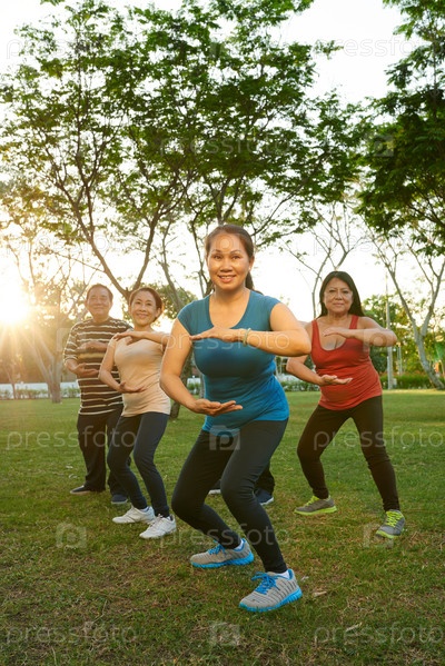 Зрелая вьетнамская женщина выполняет упражнения с группой друзей в парке