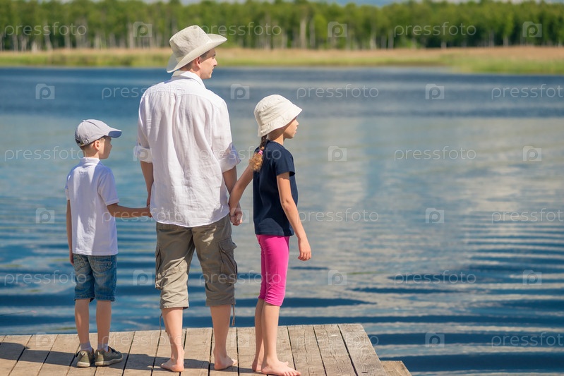 Папа с сыном и дочерью, любуясь прекрасным живописным озером