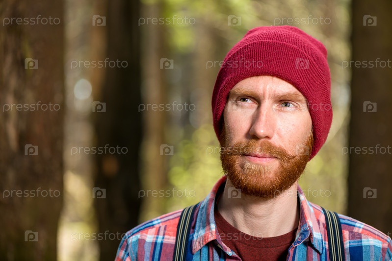 Портрет бородатого мужчины в красной шляпе в лесу