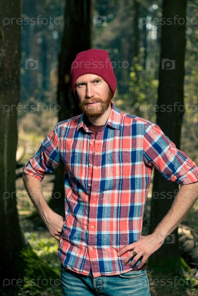Портрет серьезного человека с бородкой в клетчатой рубашке и шляпе в лесу