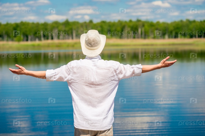 Мужчина в белой рубашке и шляпе, наслаждаясь прекрасной природой вблизи озера
