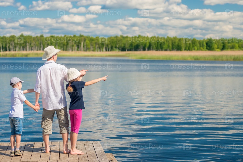 Счастливая семья на пирсе возле живописного озера
