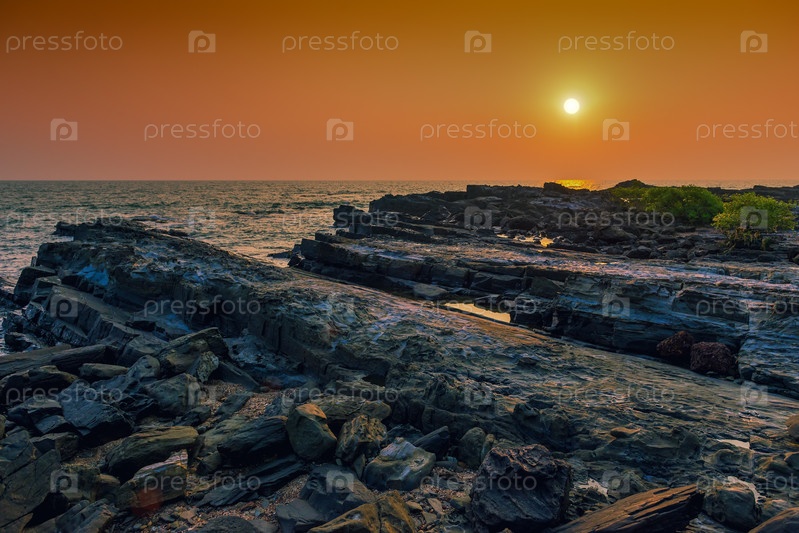 Скалистые пустынные берега и спокойное море на закате