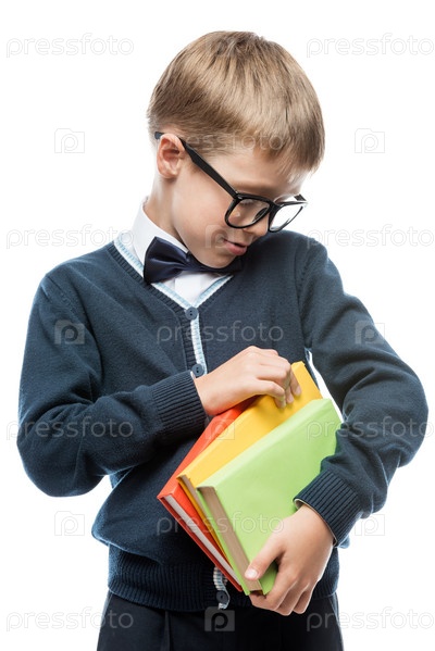 Портрет школьника в форме с книгами на белом фоне