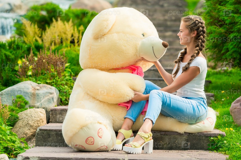 Девушка с огромным плюшевым мишкой в парке на лестнице