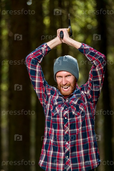 Агрессивный бородатый дровосек с топором рубит дрова в лесу