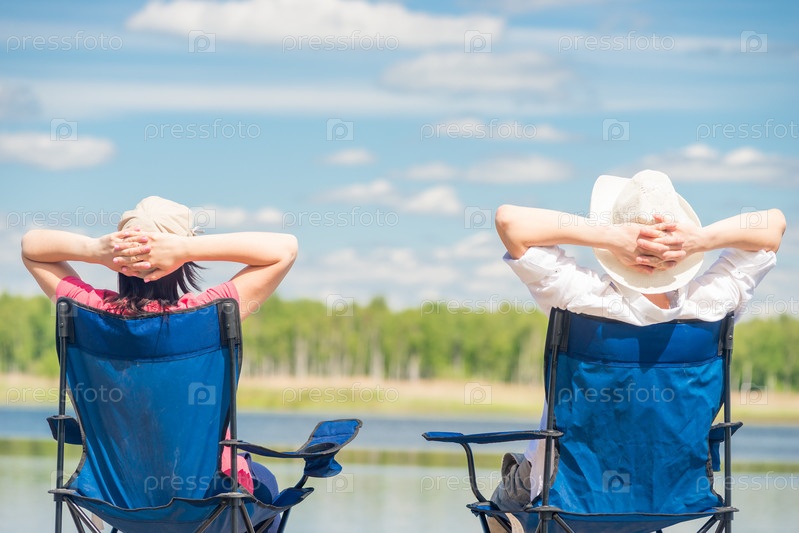 Семья на стульях отдыхает возле красивого озера
