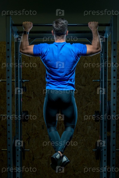 Сильный спортсмен подтягивается на турнике в тренажерном зале