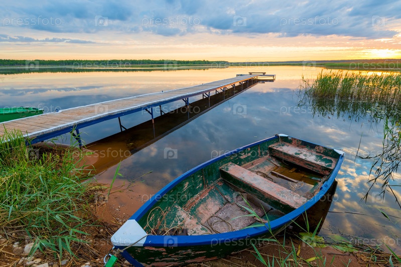 Старая лодки у берега с видом на деревянный пирс и спокойное озеро
