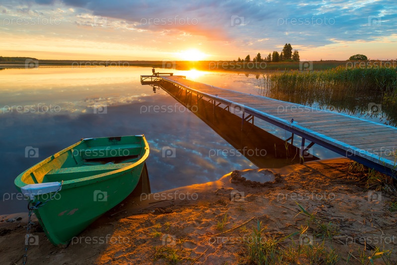 Деревянный причал и лодка в лучах заходящего солнца