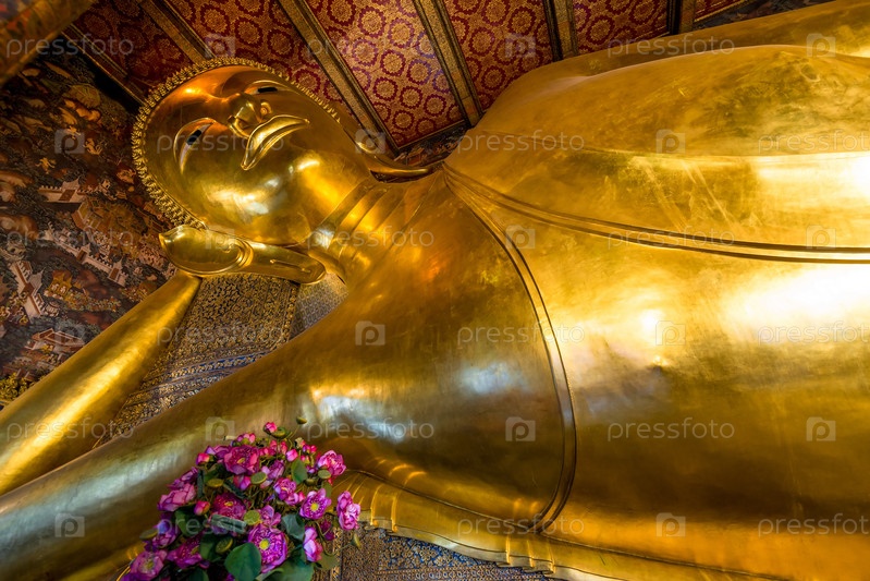 Красивая золотая статуя Будды в храме лежащего Будды в Таиланде, Бангкок