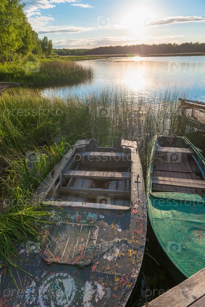Старые лодки в камышах на берегу озера утром