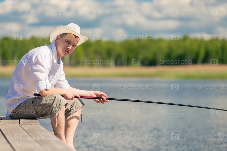 Опытный рыбак сидит на деревянном пирсе