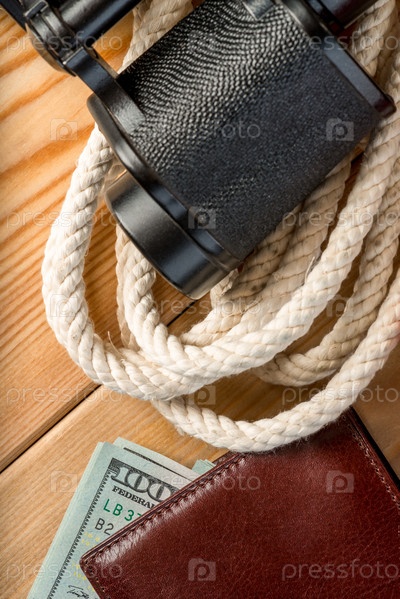 Бумажник, прочный канат и бинокль