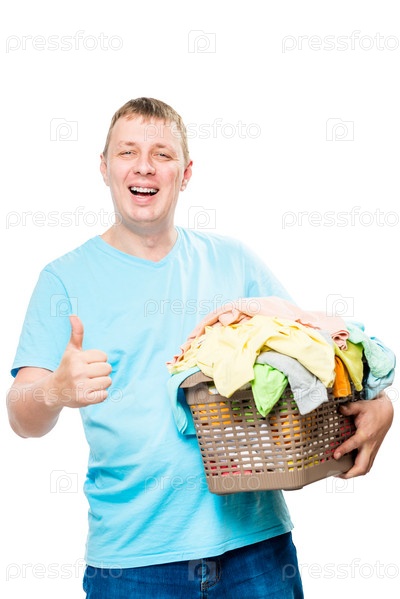 Портрет счастливого человека с корзиной чистого белья для глажения