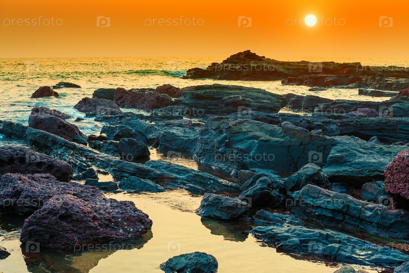 Красивый морской пейзаж и каменистый берег на закате