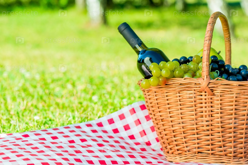 Корзина с виноградом и бутылка вина