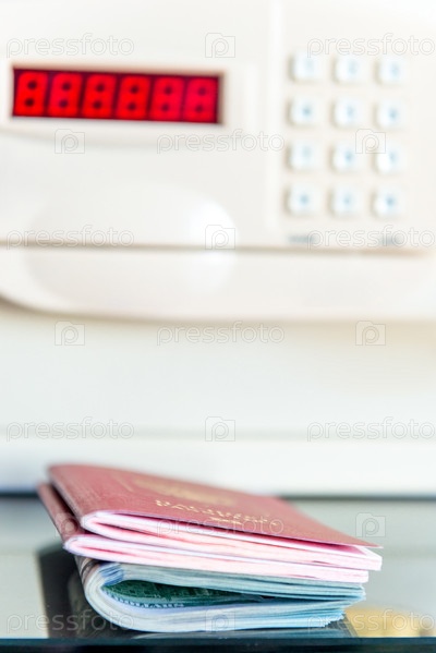 Паспорта путешественников и деньги на фоне сейфа в отеле