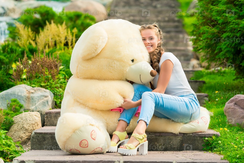 20-летняя красивая женщина с большим плюшевым медведем в парке на лестнице