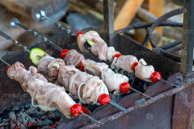 Шампур с мясом и овощами на гриле во время жарки