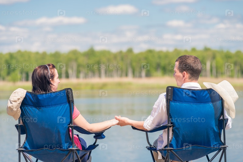 Мужчина и женщина сидят на стульях на пирсе возле озера