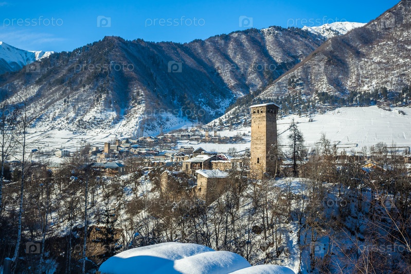 Средневековые башни в Местии в горах Кавказа, Верхняя Сванетия, Грузия