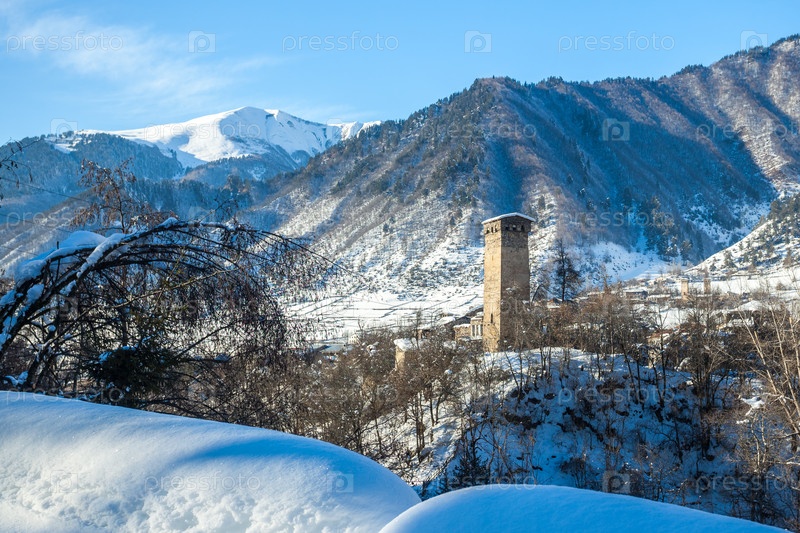 Средневековые башни в Местии в горах Кавказа, Верхняя Сванетия, Грузия