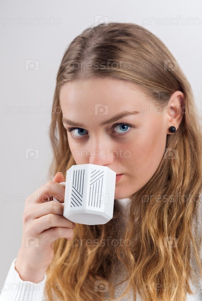 Привлекательная, голубоглазая молодая девушка с чашкой