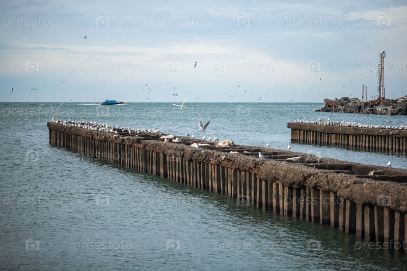 Чайки на волнорезе Черного моря, Поти, Грузия