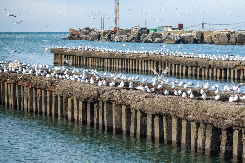 Чайки на волнорезе Черного моря, Поти, Грузия