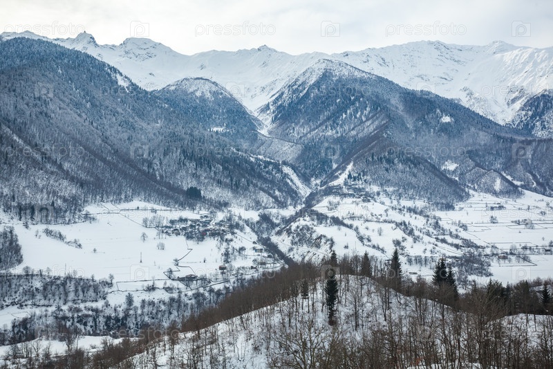 Горная деревня в горах Кавказа в зимнее время, Сванетия, Грузия