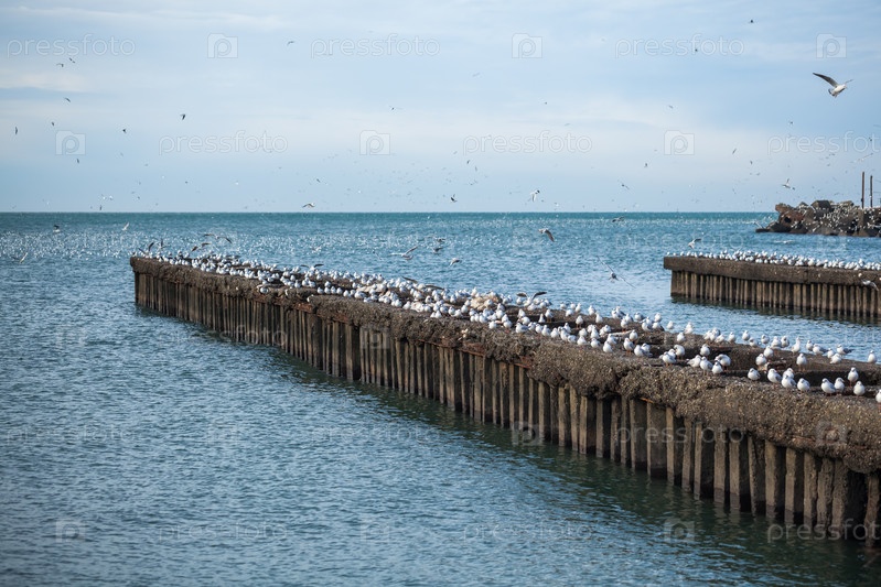 Чайки на волнорезе Черного моря, Поти, Грузия