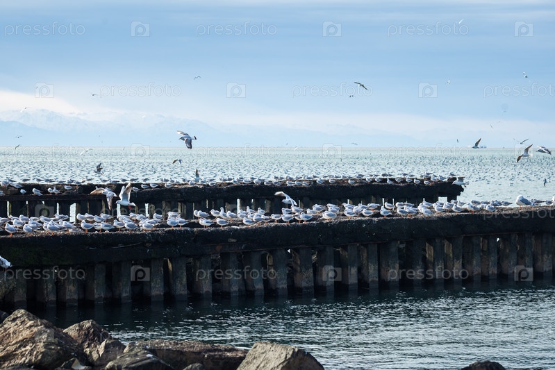 Чайки на волнорезе Черного моря, Поти, Грузия