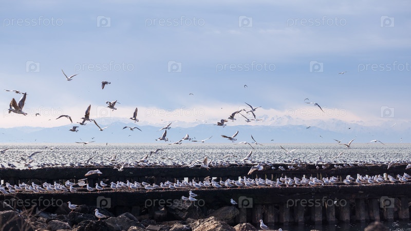 Чайки на волнорезе Черного моря, Поти, Грузия