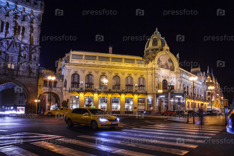 Пороховая башня и Муниципальный дом в ночное время в Праге