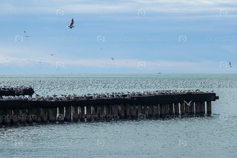 Чайки на волнорезе Черного моря, Поти, Грузия