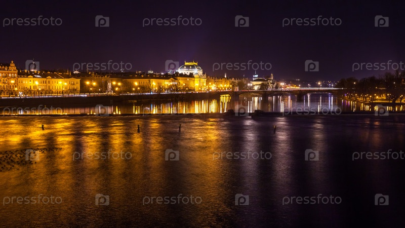 Ночь Вид на Пражский Национальный театр над рекой Влтавой, Чехия