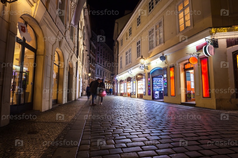 Узкая аллея с фонарями в Праге в ночное время