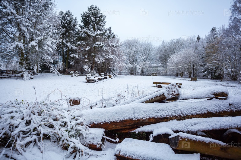 Деревянные бревна в заснеженном зимнем лесу