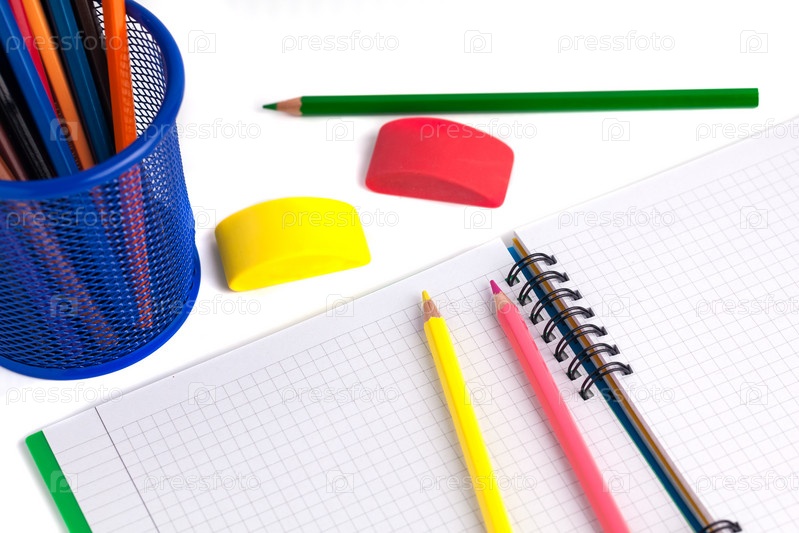 Цветные карандаши в корзине, ластик и тетради белом фоне