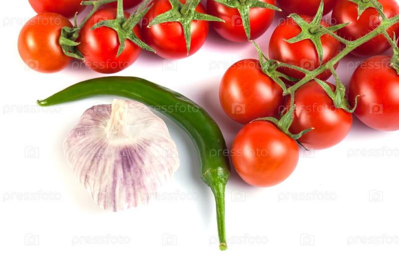 Помидоры, зеленый перец и другие овощи на белом фоне