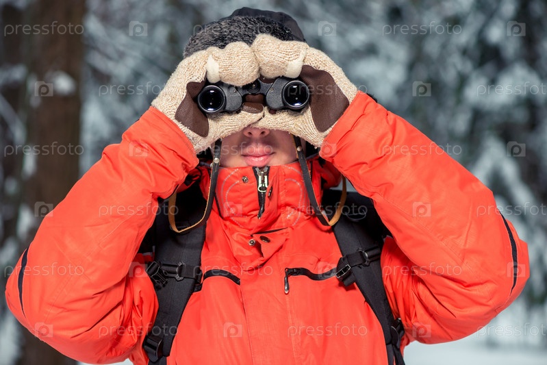 Человек с биноклем в зимнем лесу