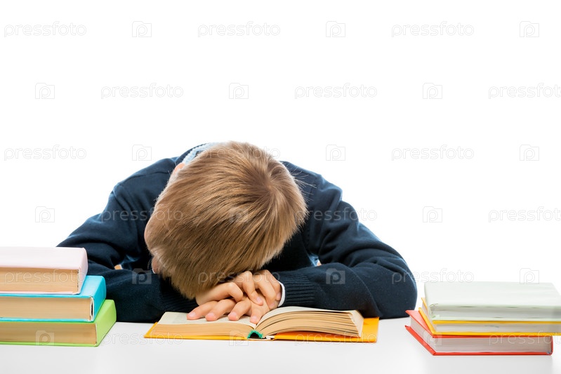 Уставший школьник заснул во время чтения книги на столе