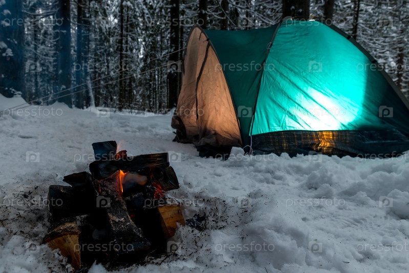 Огонь в снегу на фоне зеленой палатки в зимнем лесу