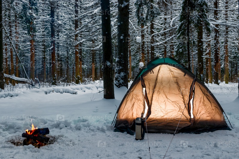 Горящий огонь возле палатки в лагере в зимнем лесу