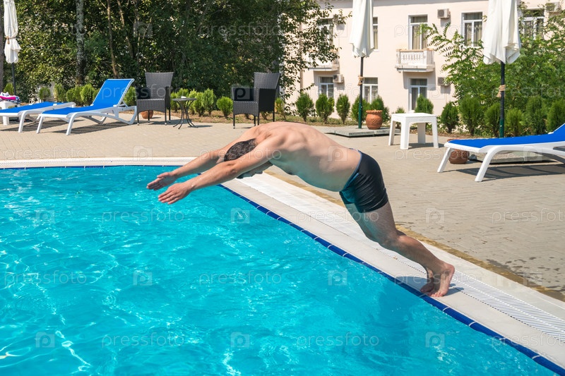 Молодой человек прыгает в бассейн на курорте