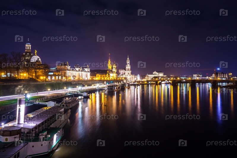Красивый ночной вид города и отражения в реке Эльба в Дрездене, Германия