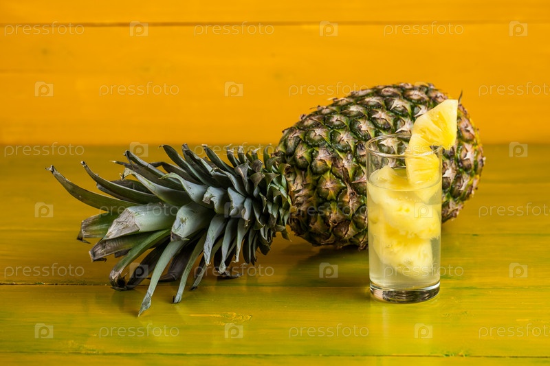 Спелый ананас и сок в стакане на желтом фоне