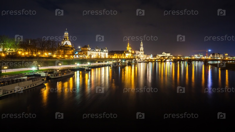 Красивый ночной вид города и отражения в реке Эльба в Дрездене, Германия