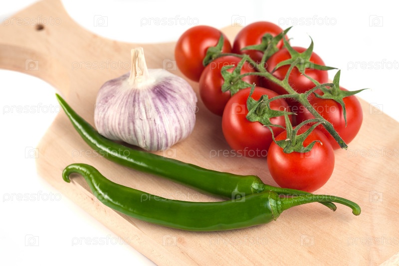 Помидоры, чеснок и зеленый перец на деревянной разделочной доске